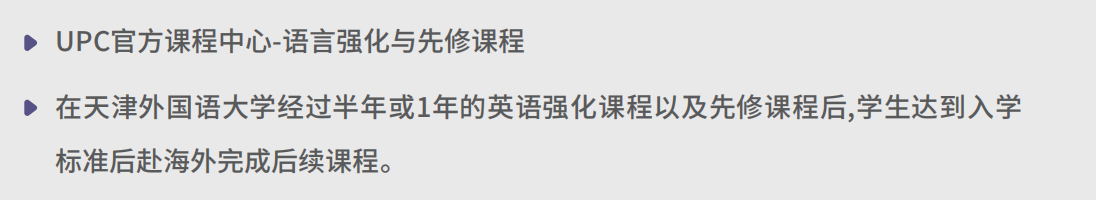 U-Path Course国际本科委托天津外国语大学海外教育中心进行U-Path Course SEA国际课程培养,发起“中马国际精英人才专项培养计划”、“新加坡名校定向培养计划”等优质项目,发挥外语学科专业和教学优势,创新培训模式,搭建规范、高效、优质的海外留学支持平台,为广大学生、家长和社会提供更优质的教育资源。